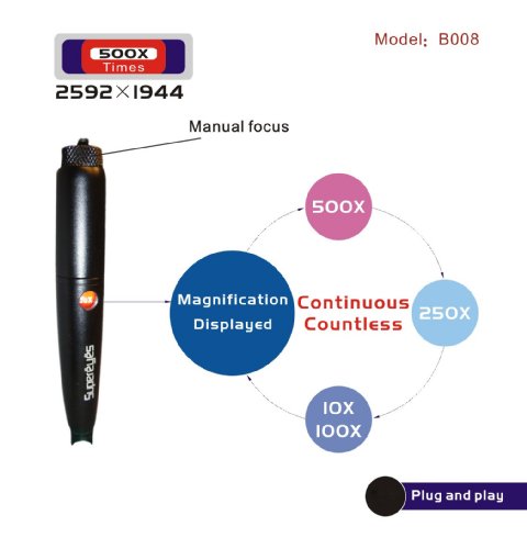 Here are some of the great features of Brand New Supereyes B008 500X USB Digital 5.0 MP Portable Pen Mini HD Manual Focus Microscope Endoscope Magnifier Camera Loupe Otoscope w/LED and Stand