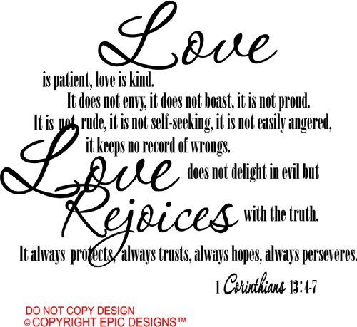 Best Buy 1 Corinthians 134-7 Love. Best Deals 1 Corinthians 13:4-7 Love is patient, love is kind. It does not envy, it does not boast, it is not proud. It is not rude, it is not self-seeking, it is not easily angered, it keeps no record of wrongs. Love does not delight in evil but rejoices with the truth. It always protects, always trusts, always hopes, always perseveres religious wall quotes arts sayings vinyl decals Best Price. Fast & Super Saver Shipping. Hot Savings!